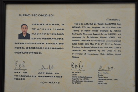 2012年5月,我院12名教师参加了由中国地震应急搜救中心和德国联邦政府技术救援署联合主办的中德政府“第一响应人”教官培训课程,系统学习并掌握了《第一响应人培训介绍》、《灾情形势评估及信息处理》、《灾情现...