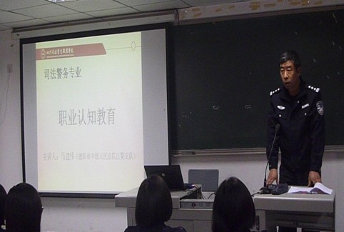 2012年11月2日下午,北校区511多媒体教室不断传来2012级司法警务专业新生的热烈掌声,一场生动的集“专业认知、导学、职业前瞻教育”为一体的新生职业认知教育讲座在这里进行。主讲者马建伟为我院聘请的校外兼职...