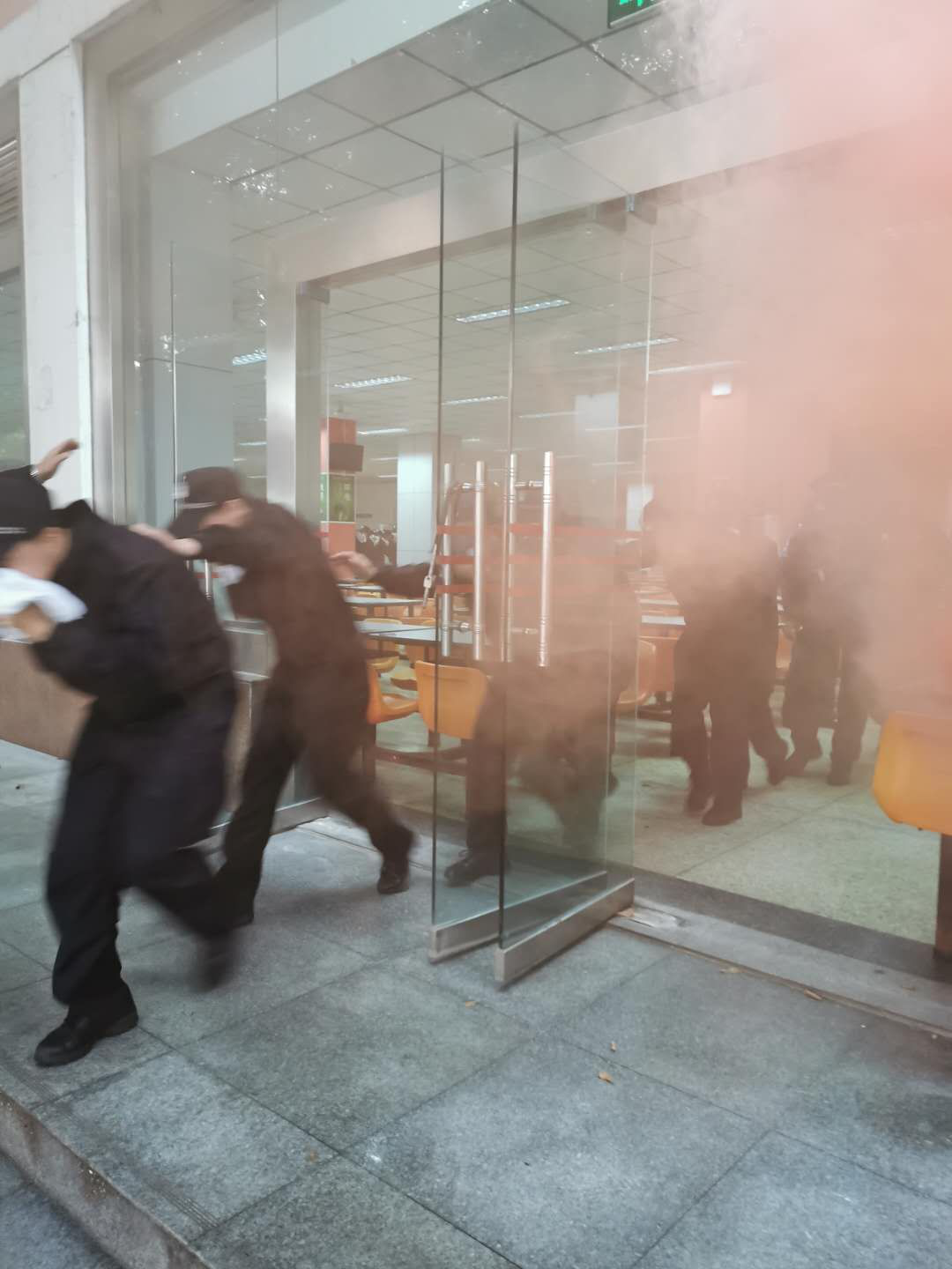 应急疏散活动模拟场景为北校区食堂800多名同学正在就餐时突发火灾。15时05分,火警警报响起后,北校区食堂顿时浓烟滚滚,同学们弯着腰一只手用湿毛巾或衣物捂住口鼻、另一只手搭在前面的同学肩膀上(防止跌倒或踩踏)安全迅速撤离,工作人员按照分工在三个出口负责疏散学生。三分钟内,所有学生都安全有序地撤离到安全地带。