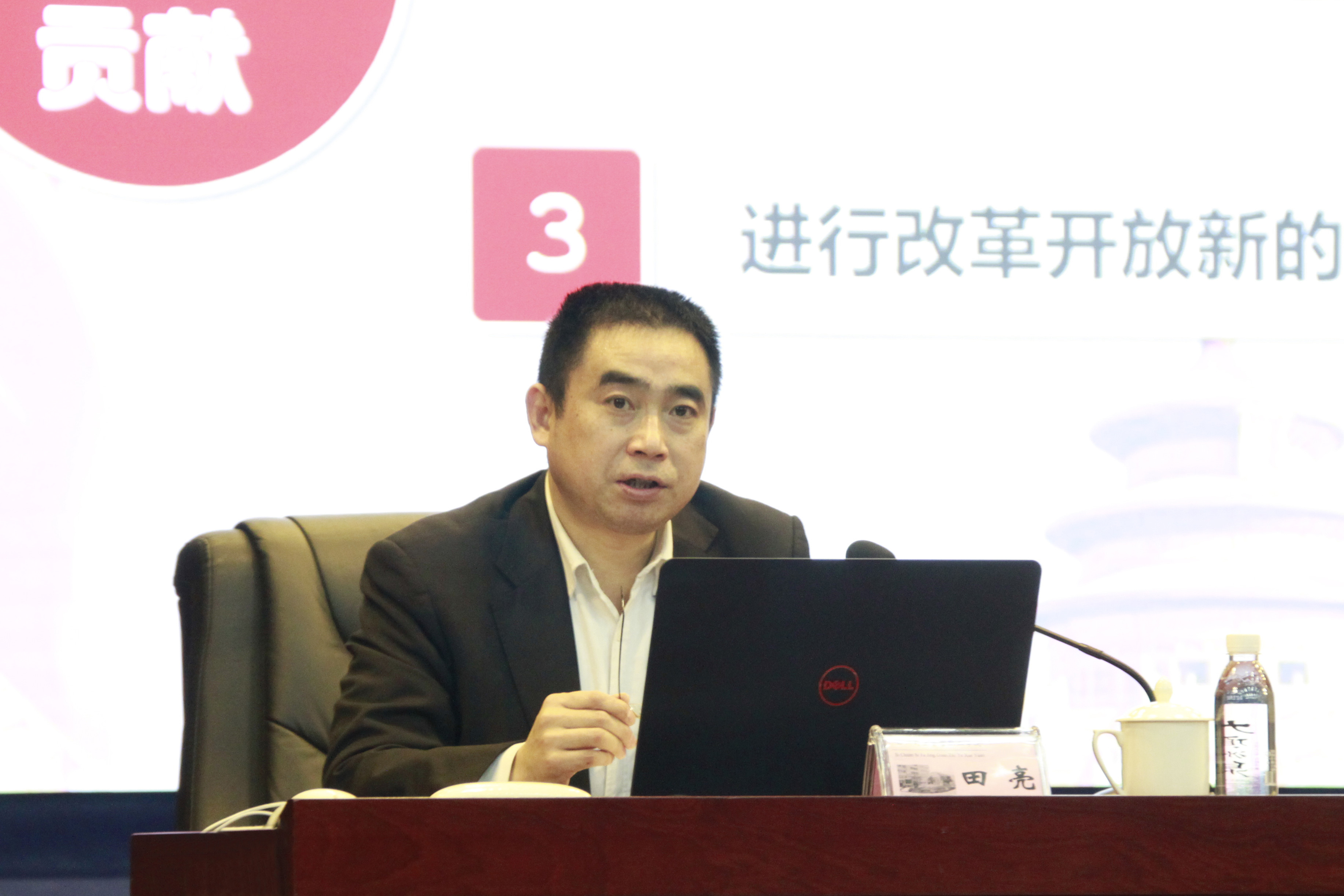田亮书记在党课中紧紧围绕中国共产党为中华民族作出的“完成新民主主义革命,建立中华人民共和国;完成社会主义革命,确立社会主义基本制度;进行改革开放新的伟大革命,极大解放和发展社会生产力”三个伟大历史贡献,系统回顾了中国共产党在新民主主义革命时期、社会主义革命时期、改革开放和社会主义现代化建设时期等不同历史时期的奋斗历史,以详细的数据、生动的事例和鲜活的场景说话,深刻阐述了为什么只有中国共产党才能救中国、强中国、富中国,深刻回答了历史和人民为什么选择中国共产党。