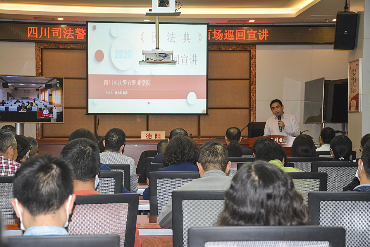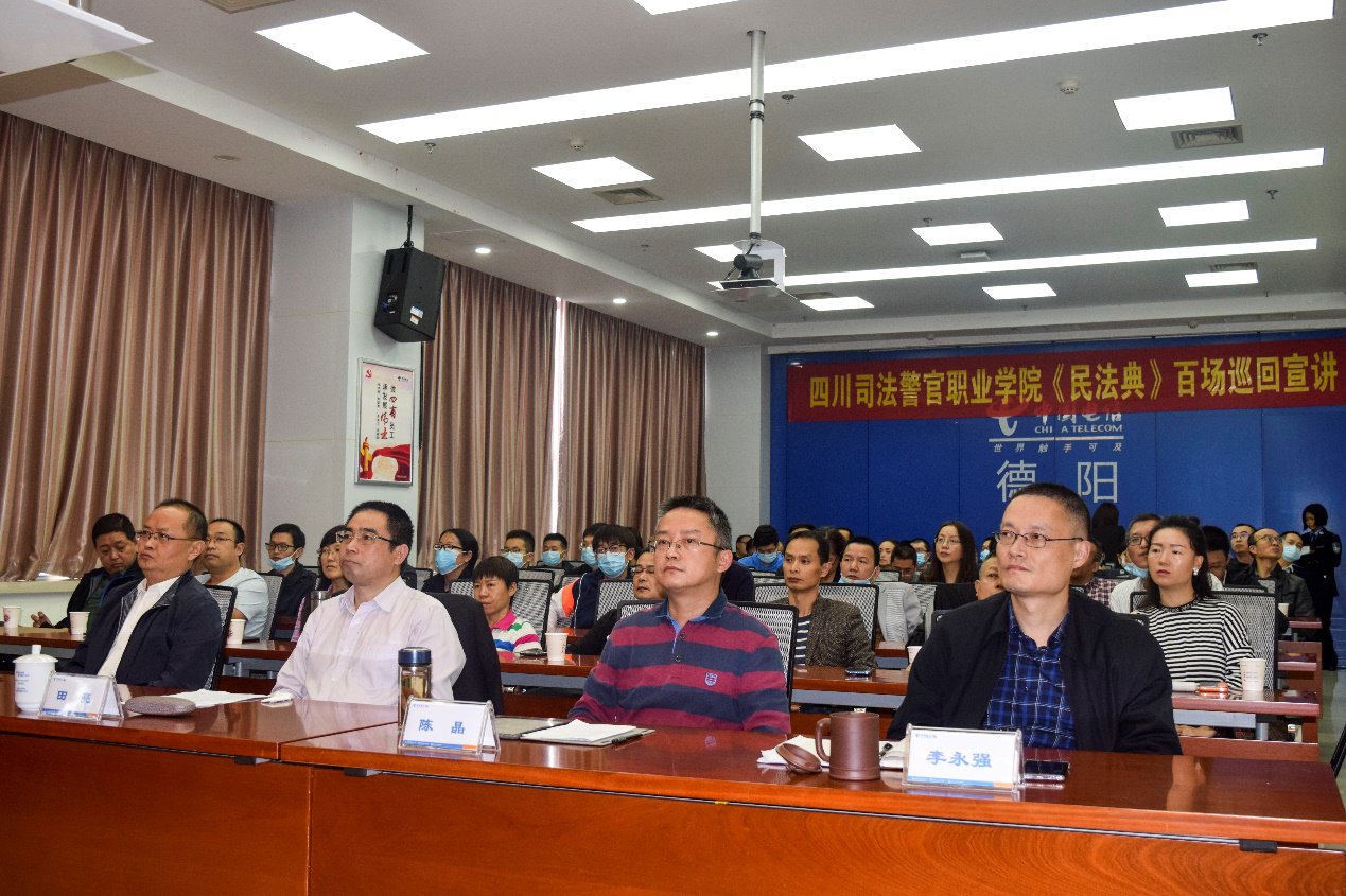 田亮书记在致辞中提到,此次“《民法典》百场巡回宣讲”是深入贯彻习近平总书记关于学习、推进、保障《民法典》实施的重要讲话精神,认真落实省委宣传部等8部门印发的《四川省学习宣传〈中华人民共和国民法典〉实施方案》的具体举措。电信德阳公司作为警院的合作伙伴,对警院工作特别是信息化建设工作给予了长期有力的支持。希望通过此次宣讲活动,把法律知识、法治理念、法治精神带进电信德阳公司,让双方进一步加强交流与合作,携手并进、互惠共赢。