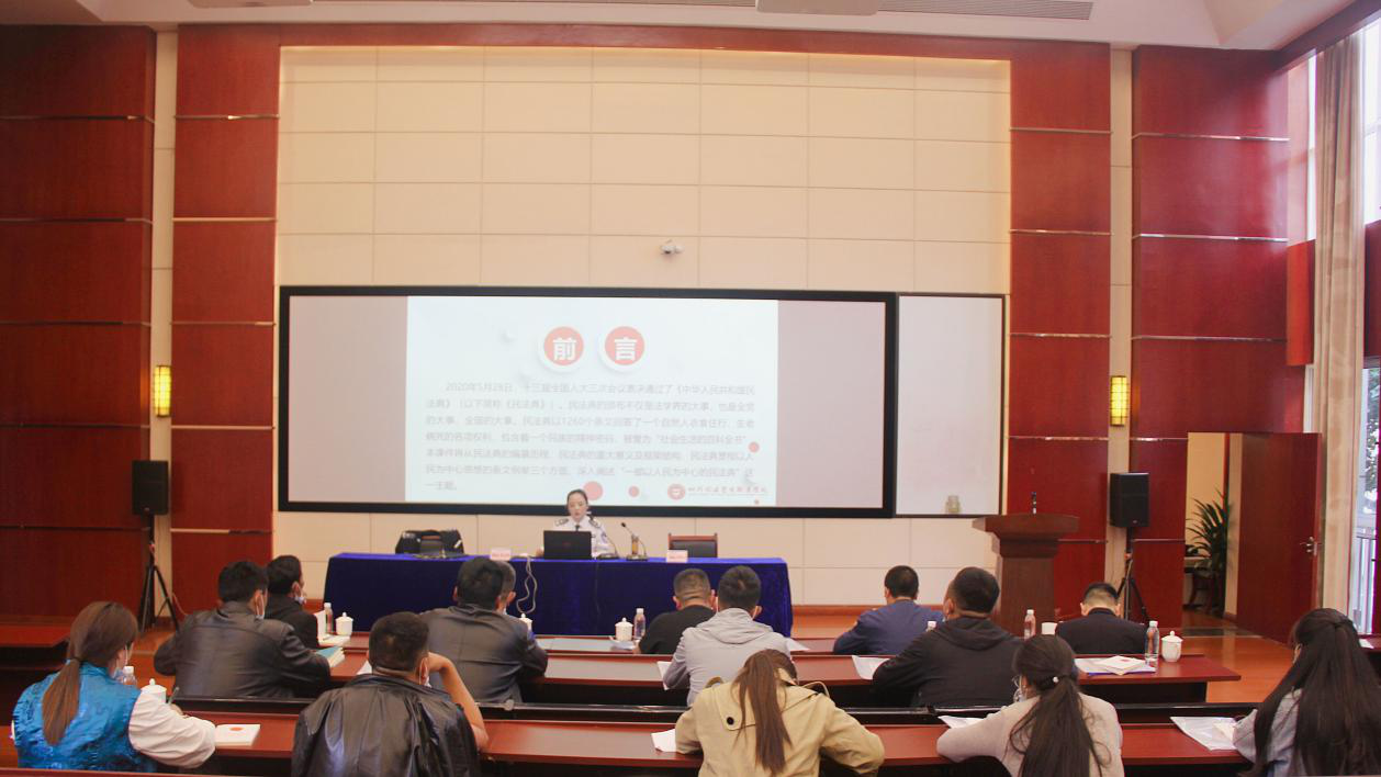 为深入学习贯彻习近平总书记关于推动民法典实施的重要讲话精神,认真落实《四川省学习宣传〈中华人民共和国民法典〉实施方案》的安排部署,学院将“法律扶贫”作为政治责任,将法治宣传融入脱贫攻坚,于10月9日为对口帮扶的甘孜州新龙县通宵镇16名基层干部举办了民法典专场宣讲,法学系唐永莉教授主讲,政治部副主任张彤致辞。