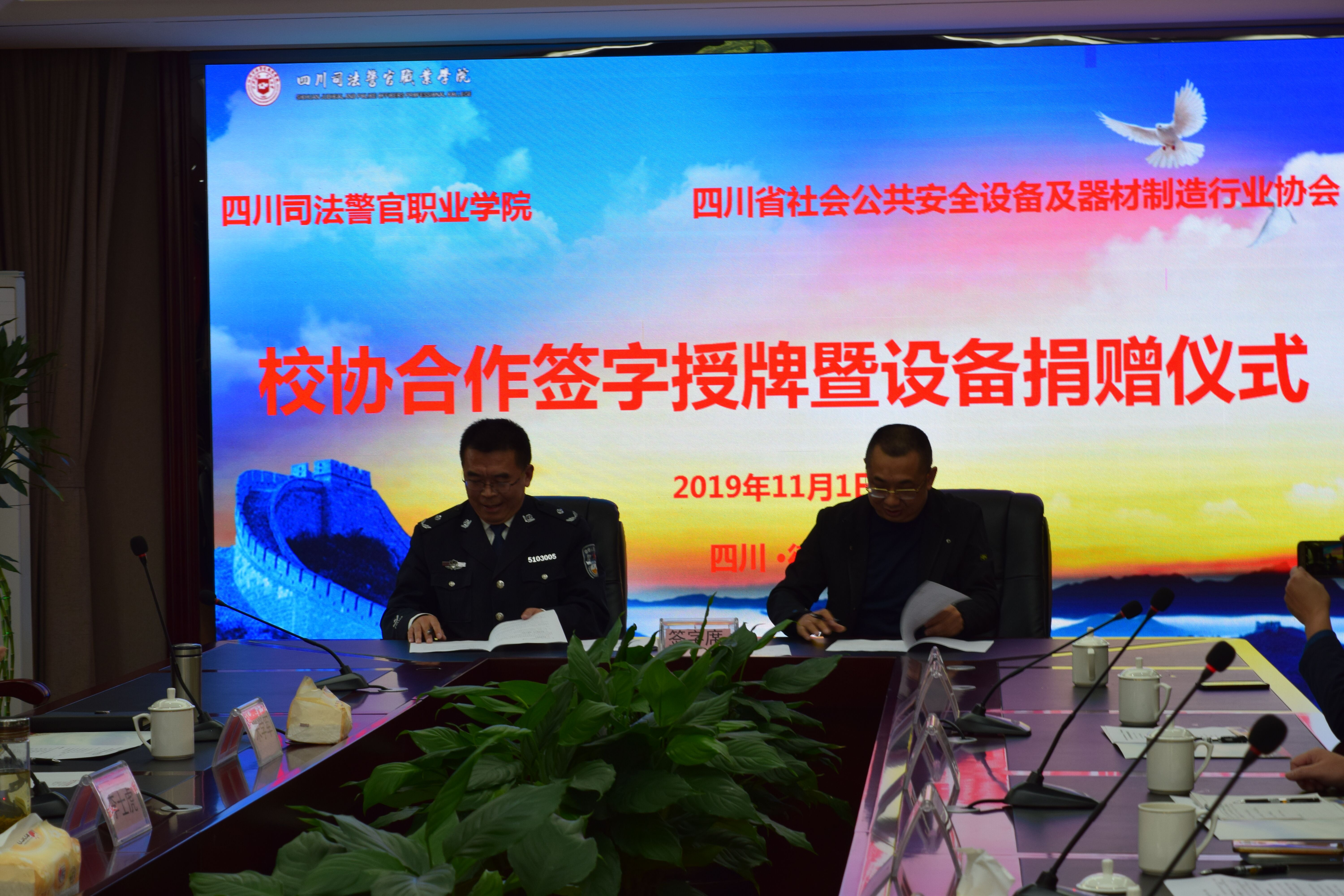 校企合作、产教融合是高职教育最本质的特征,也是彰显高职教育特色、创新人才培养模式、培养高素质技术技能型专门人才的基本途径。2019年11月1日,学院安防专业又迎来了新的发展契机,学院与四川省社会公共安全设备及器材制造行业协会(以下简称四川安协)校企共建安防专业签字授牌暨捐赠仪式在行政楼5楼会议室隆重举行。四川安协会长芦润平、四川安协秘书长黄国湘等6人出席了捐赠仪式,学院刘世模副院长率教务处、警体部负责人和侦查系部分同志参加了会议。