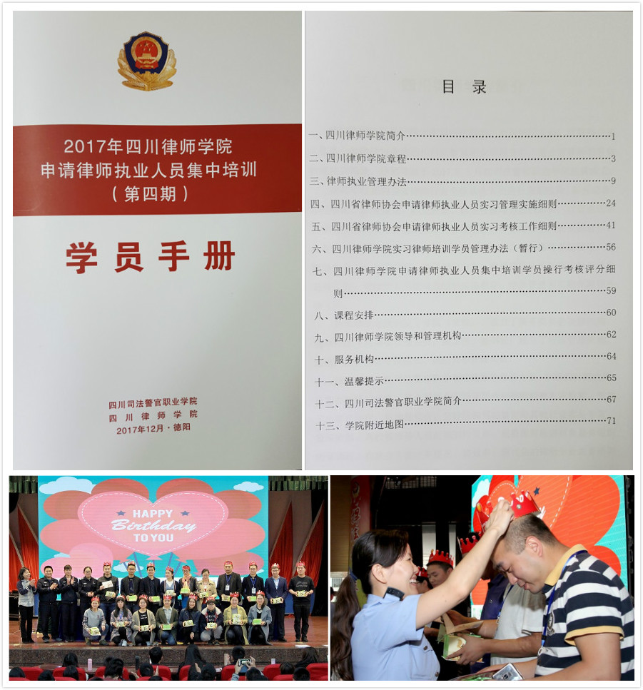 三是坚持以人为本,着力提升服务水平。完善制度体系,建立健全内部管理运行规章制度,为每期培训汇编《学员手册》,着力提升培训工作的制度化、规范化水平。创新管理模式,建成律师学院微信公众平台,开通查询教学计划、考试安排、培训纪律、生活服务以及考勤、评教等多种功能。突出人文关怀,每期培训为当月生日学员举办集体生日会,为他们送上生日蛋糕和诚挚祝福,以增强学员的团队意识和集体荣誉感,提升学院的号召力和凝聚力。