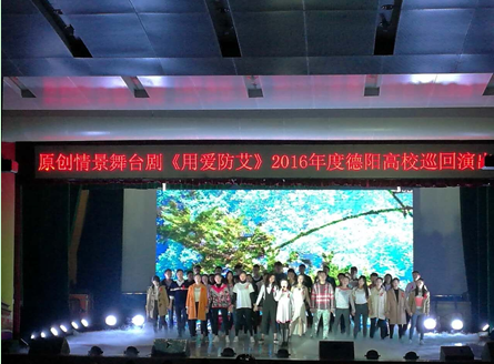 18日下午3点,我系组织150余名师生观看了由德阳市疾病预防控制中心组织的原创情景舞台剧《用爱防艾》。全剧主要讲述了深深相爱的身患艾滋病的男孩与女孩因为病情无奈分手,却因矢志不渝的爱而不舍得放弃彼此,最终重获幸福的故事。剧情反映了众多艾滋病毒携带者在社会中受到歧视、排斥的现象,令观众们欣慰的是,受到不公平待遇的病人在红丝带志愿者们帮助下,重新获得了救赎。