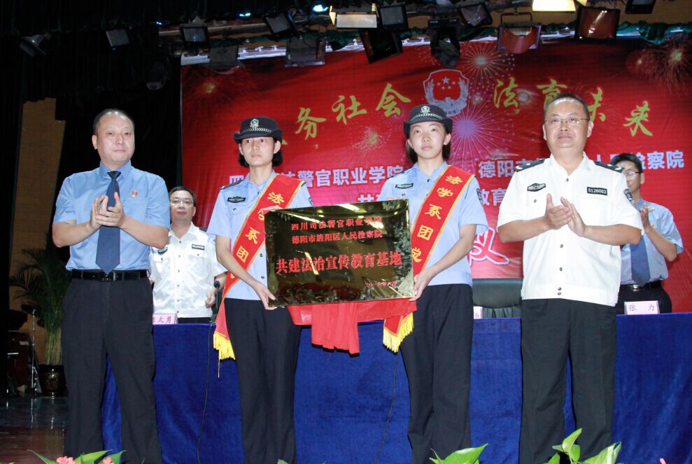 在启动仪式上,张院长表示,共建法治宣传教育基地是我校法治建设史上的一件大事,是法治教育工作的一项创举,是我们深入开展法律进校园、推进依法办事、依法治校,建设和谐校园的重要举措。对于加强和改进青年思想道德建设,全面提高青年的法律意识,帮助青年树立正确的法纪观念,维护青年合法权益等方面都具有十分重要的意义。并希望加强与旌阳区检察院的密切联系,建设好法治宣传教育基地。紧接着,张院长和陈检察长为“法治宣传教育基地”揭牌,宣布“基地”正式成立,随后陈检察长为青年志愿服务队授旗,学生杨雅君代表志愿者宣誓。接着,我院法学系学生带来的歌舞、小品、独具警校特色的擒敌拳表演赢得了在场领导、来宾的阵阵喝彩,把启动仪式推向了高潮。最后,与会领导、来宾、及师生参观了禁毒展览。