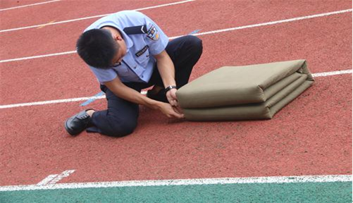 本届职业技能竞赛包括叠军被、立姿搜身、队列指挥与队前讲话3个科目。6月14日下午,在北校区运动场首先举行了叠军被和立姿搜身两个科目的比赛。叠军被是狱所人民警察必须掌握的一项内务技能,对警察院校学生良好生活习惯的养成起着重要作用。比赛要求参赛选手在规定的时间内把自己的被子叠成方正的“豆腐块”。各位选手都小心翼翼地理被子、捏边、塑角、整平,力求每一个细节的完美。立姿搜身是监狱刑罚执行中的一项常用技能。在实施过程中,选手们选择好正确的站位后,用双手逐一挤压检查模拟服刑人员的头发、衣领、腰带、裤脚、鞋袜等部位。检查时,选手的口令准确,搜身动作规范。