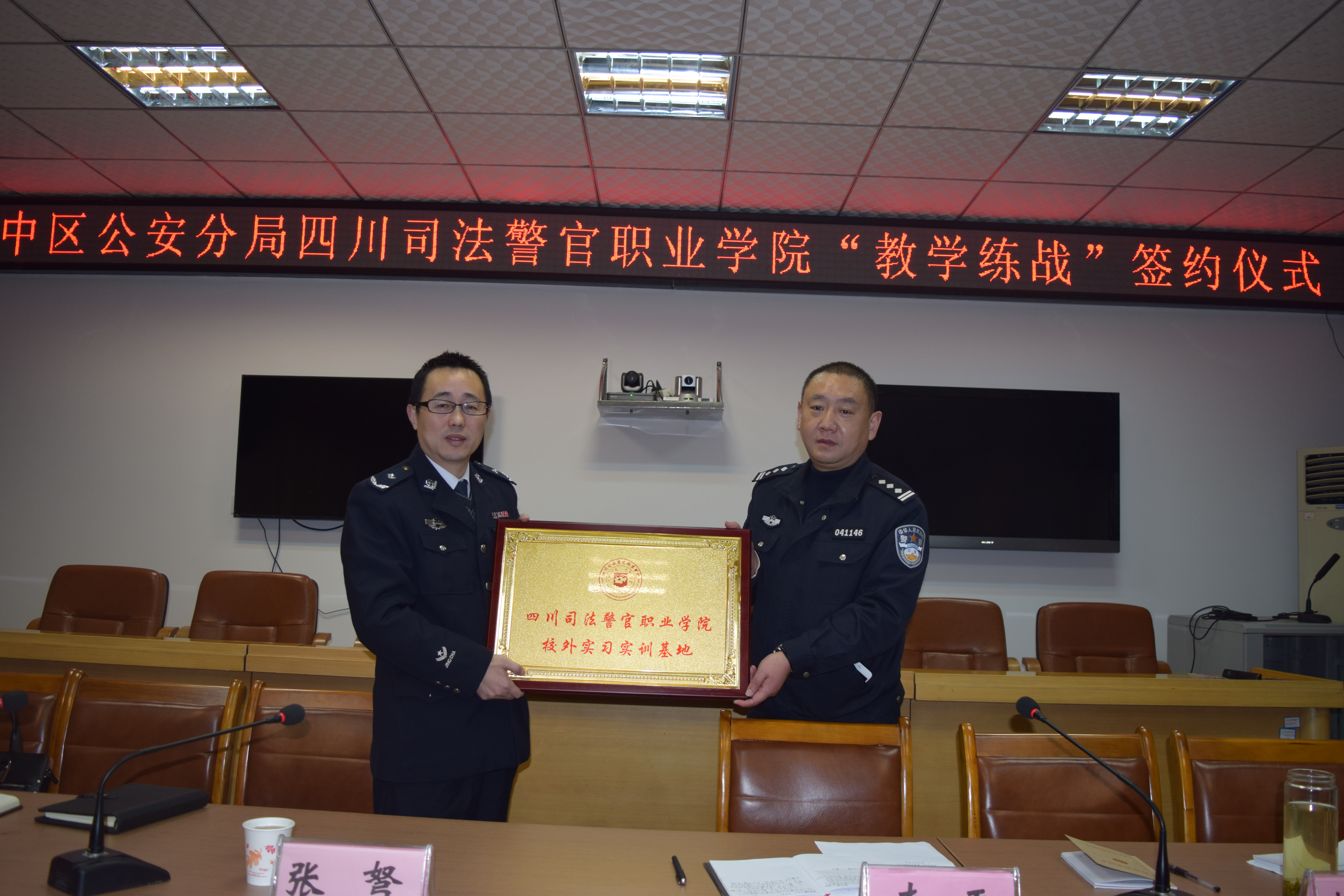 仪式上,学院侦查系主任张弩与乐山市市中区公安分局政委李平进行了校外实习实训基地签约和授牌。