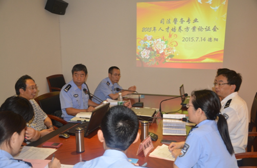 中共十八届四中全会对全面推进依法治国作出了重大部署,为培养适应社会需求的高素质法律实务人才,强化专业定位与建设,提升教学质量,规范人才培养模式,2015年7月14日,司法警务专业召开了2015级人才培养方案专家论证会。论证会邀请了四川邮电职业学院经管系主任胥学跃、德阳市中级人民法院调研员马建伟等精通专业建设和熟知行业需求的校外专家。学院副院长张大立、法学系主任陈太勇、司法警务专业教学团队全体教师参加会议。论证会由法学系副主任廖鸿玲主持。