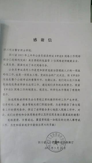 5月中旬,由四川省人力资源和社会保障厅组织的全省公务员考试阅卷工作正式启动,学院选派了张磊等三名老师参加了笔试科目《申论》的阅卷。
