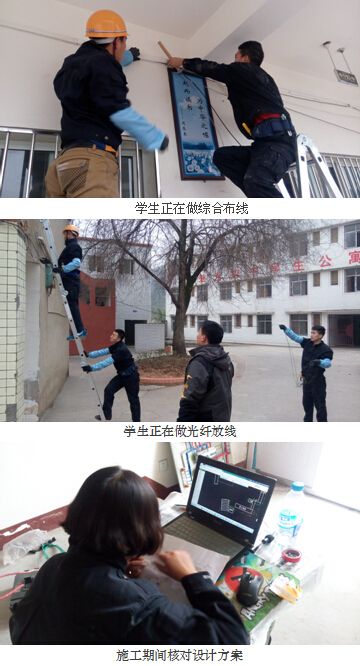 侦查系教师胡江涛、邱波和该专业20余名学生组成工程队,按照师生共同设计好的方案执行工程任务,学生们运用专业技能,亲手完成了综合布线,设备安装,系统调试等工作。参与援建的学生被分成了5个小组,每天晚上以小组会议的形式总结当天的经验,并由老师布置第二天的工程任务单。在施工现场老师负责工程现场管理与调度,为了解决工程中的一些疑难问题,还聘请了一名从业6年的老师傅负责现场技术指导。