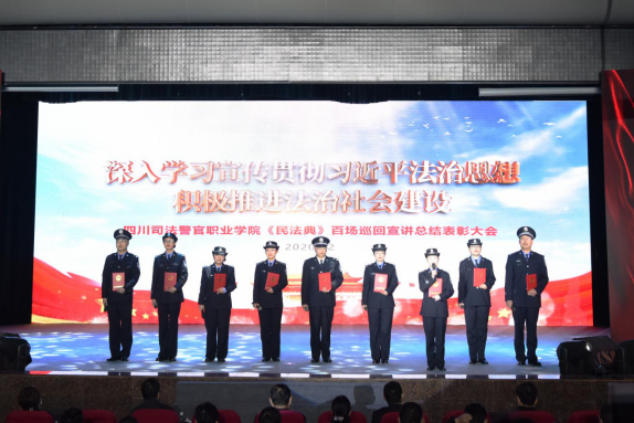 12月22日,四川司法警官职业学院民法典百场巡回宣讲总结表彰大会在该校学术报告厅举行。省教育厅一级巡视员胡卫锋,省司法厅党委委员、副厅长孔祥贵出席会议并讲话。学院党委书记田亮宣读表彰决定。省教育厅、省司法厅有关单位负责同志,德阳市委政法委、德阳市教育局、德阳市司法局等单位负责同志,学院班子成员、各部门负责人和师生员工代表等参加大会。