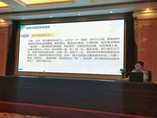 敖晶晶首先对国内外毒品蔓延形势和毒品的危害作了介绍,并通过省女子强戒所内吸毒人员的典型案例,警示告诫学生充分认识毒品的严重危害,即“毁灭自己,祸及家庭,危害社会”。她接着就毒品的种类、共同特征、成瘾原因以及防毒措施等作了详细介绍。敖晶晶还特别列举分析了毒贩诱人吸毒的常见陷阱,提醒同学们提高警觉性,确保自身安全。