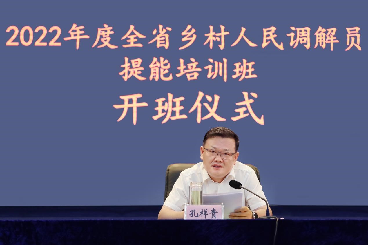 四川省司法厅党委委员、副厅长孔祥贵出席开班仪式并作开班动员讲话。孔副厅长强调了开展本次培训的重要性,他就切实加强新时代基层人民调解工作讲了三点意见。一是充分认识人民调解工作的重要意义,进一步增强做好基层人民调解工作的使命感。做好人民调解工作是维护国家政治安全的迫切需要,是维护社会和谐稳定的迫切需要,是推进法治乡村建设的迫切需要。二是精准把握人民调解工作面临的形势问题,进一步增强做好基层人民调解工作的紧迫感。我省人民调解工作还存在矛盾纠纷排查化解力度不足、人民调解员依法规范调处案件能力有待提高、基层人民调解工作与矛盾纠纷发展不相适应、人民调解社会影响力有待加强等问题,亟须进一步加强和改进。三是坚定瞄准人民调解工作的目标要求,进一步推动基层人民调解工作提质增效。要提高政治站位,强化责任担当;要坚持问题导向,提升综合能力;要坚持多措并举,加强纠纷预防调处;加大宣传引导,扩大社会影响。孔副厅长勉励学员珍惜机会、严守纪律,认真学习、积极实践,把自己摆进去、把职责摆进去、把工作摆进去,切实学有所思、学有所悟、学有所获,奋力推动全省人民调解工作再上新台阶。