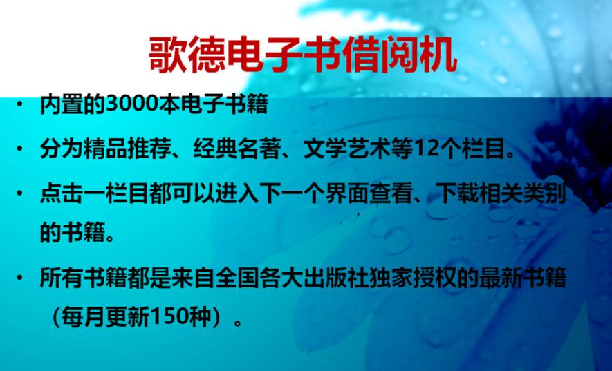 该台设备是图情中心近期引进的“歌德电子借阅机——24小时电子自助借阅系统”。歌德电子书借阅机内置3000册电子图书、100种大众期刊、400集精选高清优质的学术视频讲座等,每个月自动更新150种最新图书。内容涵盖精品推荐、经典名著、生活保健、经管理财、成功励志、小说传记、历史军事、文学艺术、人文社科、政治法律、人生哲学、亲子育儿等十二个热门分类。歌德电子借阅机突破了图书馆时间、空间限制,充分的为读者提供身边的移动数字化阅读服务。让知识随身携带,让阅读无处不在。