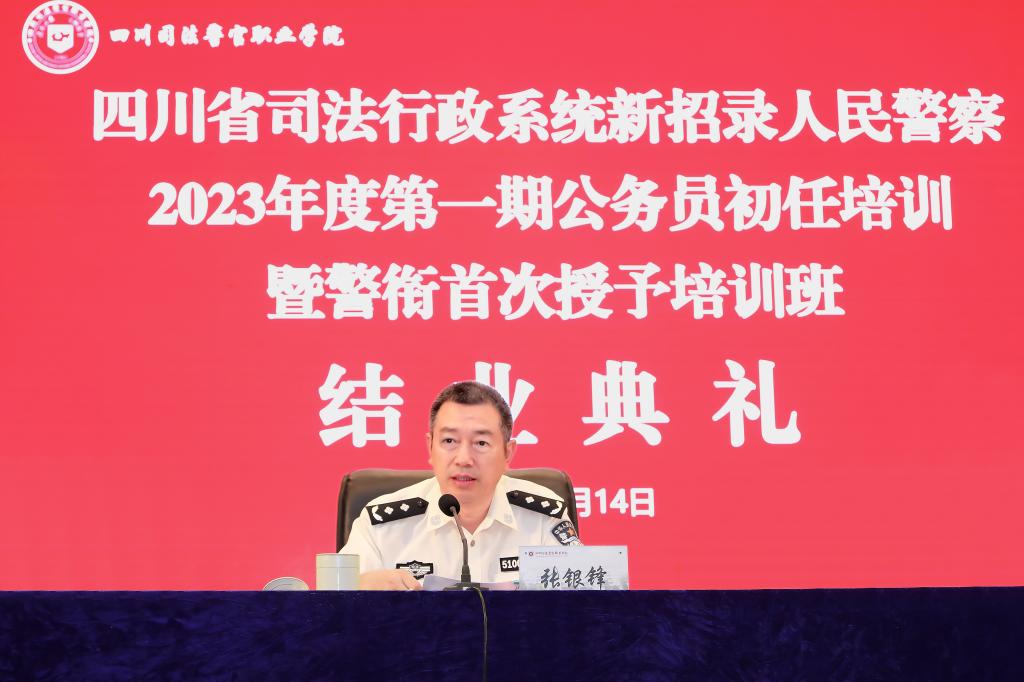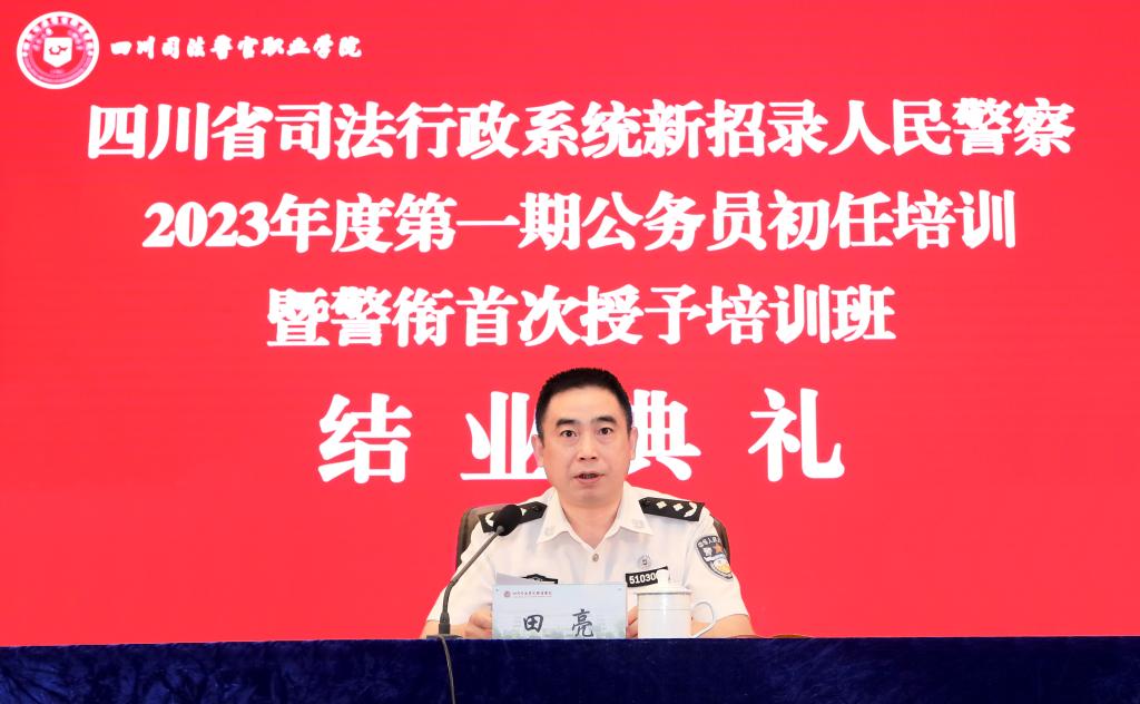 7月14日上午,伴随着激昂澎湃的国歌声,四川省司法行政系统新招录人民警察2023年度第一期公务员初任培训暨警衔首次授予培训班结业典礼在学院北校学术报告厅举行。省司法厅二级巡视员、厅政治部(警务部)副主任张银锋,学院党委书记田亮,省司法厅政治部(警务部)人事警务处处长曹永强,省监狱管理局政治部副主任应维辉、省戒毒管理局政治部副主任张学六出席结业典礼。结业典礼由学院党委委员、副院长胡蓉主持。