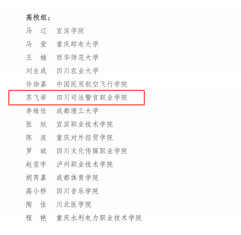 川渝青年教师风采大赛旨在深入贯彻落实党的二十大精神和习近平总书记关于教育的重要论述,推动成渝地区双城经济圈教育协同发展,彰显川渝青年教师“为党育人、为国育才”的使命担当和青春风采。本届大赛川渝两地共推荐3858名教师,分别参加学前组、小学组、中学组及高校组四个组别比赛,经过初赛、复赛、大众评选、专家评审层层角逐,来自川渝地区的120位参赛选手进入总决赛。苏飞举老师经过即兴演讲与才艺展示两个环节比拼,荣获总决赛三等奖。