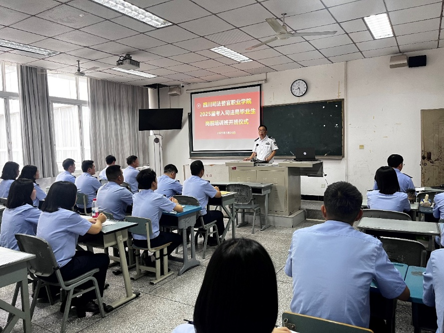 5月26日上午,2025届考入司法局毕业生岗前培训班在学院凯江校区举行开班。学院二级巡视员陈太勇出席开班仪式并讲话,教务处负责人余训锋主持开班仪式,培训班班主任和25名毕业生参加。