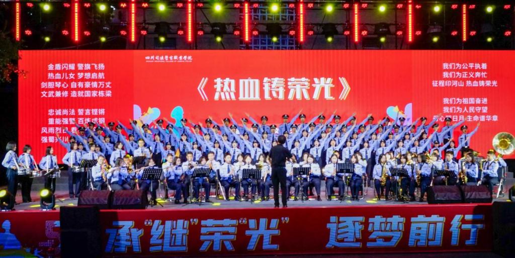 闭幕式晚会宛如一场绚丽的视听盛宴,分为 “逐梦启程”“荣光映照”“家国有梦”“青春担当”“奔赴星辰” 五个篇章。晚会节目形式丰富多样,涵盖舞蹈、小品、朗诵、情景剧、武术、合唱等,全方位展现了警院学子的青春风采与精神风貌,将信仰与热爱、家国与理想、传统与青春紧密相连。