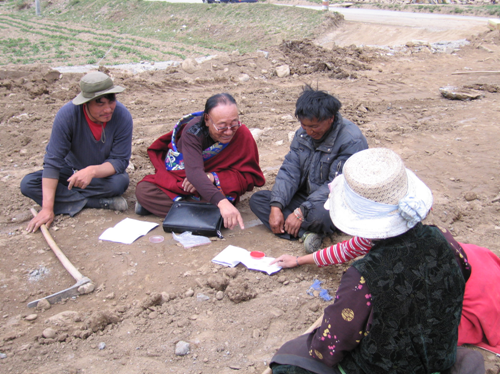 甘孜州炉霍县优秀人民调解员白玛泽仁(左二)在田边地角调解矛盾纠纷