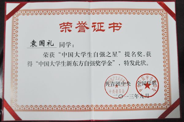 我院袁国礼同学荣获“中国大学生自强之星”提名奖,获得“中国大学生新东方自强奖...