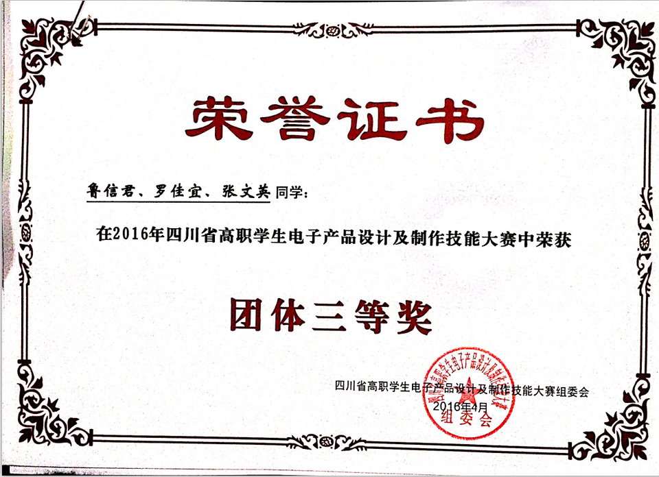 比赛颁奖典礼 技能大赛现场 荣誉证书 2016年4月17日,四川省高职学生“质肇杯”电子产品设计与制作技能大赛在成都纺织高等专科学校圆满落下帷幕,来自全省22个高职院校共计41...