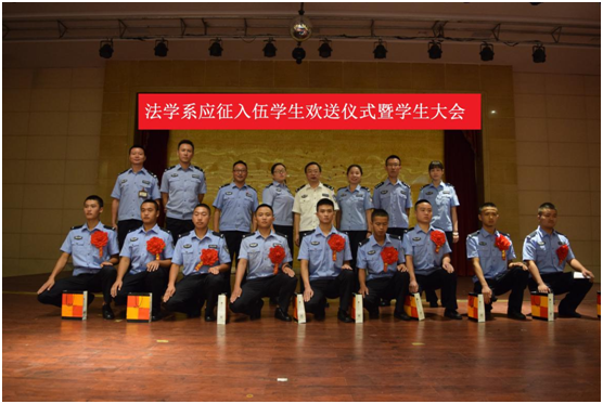 ---法学系举行应征入伍学生欢送仪式暨学生大会 为积极响应国家大学生应征入伍的号召,加强学生纪律意识,营造新学期良好的学习、生活氛围。法学系全体师生于2018年9月3日上午,在南校艺术中心举行“法学系应征入...
